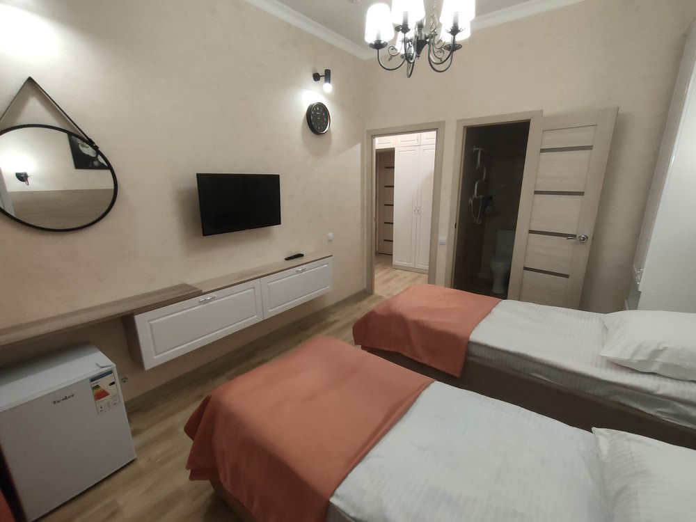 Площадь номера - 15 кв.м. 2 осн. места. Мебель: зеркало, кровати односпальные /одна двуспальная кровать, прикроватные тумбочки, стол, стул, шкаф. Оборудование: кондиционер, мини-холодильник, телевизор, чайный набор посуды, электрочайник. Санузел: с душем, туалетные принадлежности, фен. Сервис: Wi-Fi бесплатно, смена полотенец, смена постельного белья, уборка номера.