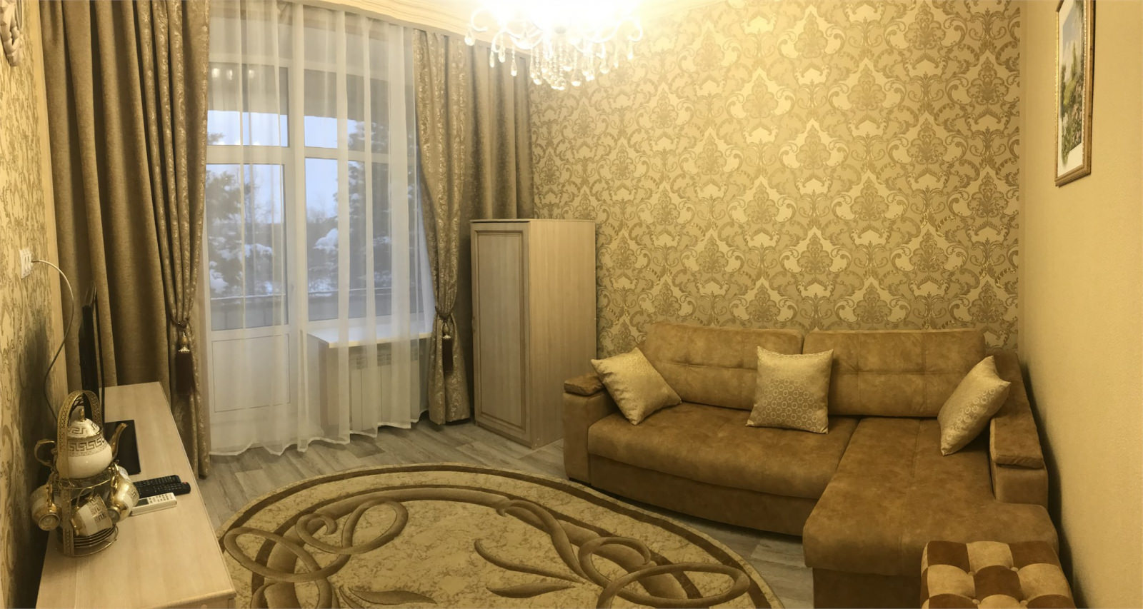Площадь номера - 35 кв.м. 2 осн. места. 1 доп. место. Мебель: диван, зеркало, кровать двуспальная, прикроватные тумбочки, стол, столик журнальный, стулья, шкаф, шкаф для посуды. Оборудование: гладильная доска, кондиционер, мини-холодильник, набор посуды, телевизор, утюг, чайный набор посуды, электрочайник. Санузел: с душевой кабиной, туалетные принадлежности, фен. Сервис: Wi-Fi бесплатно, смена полотенец, смена постельного белья, уборка номера.